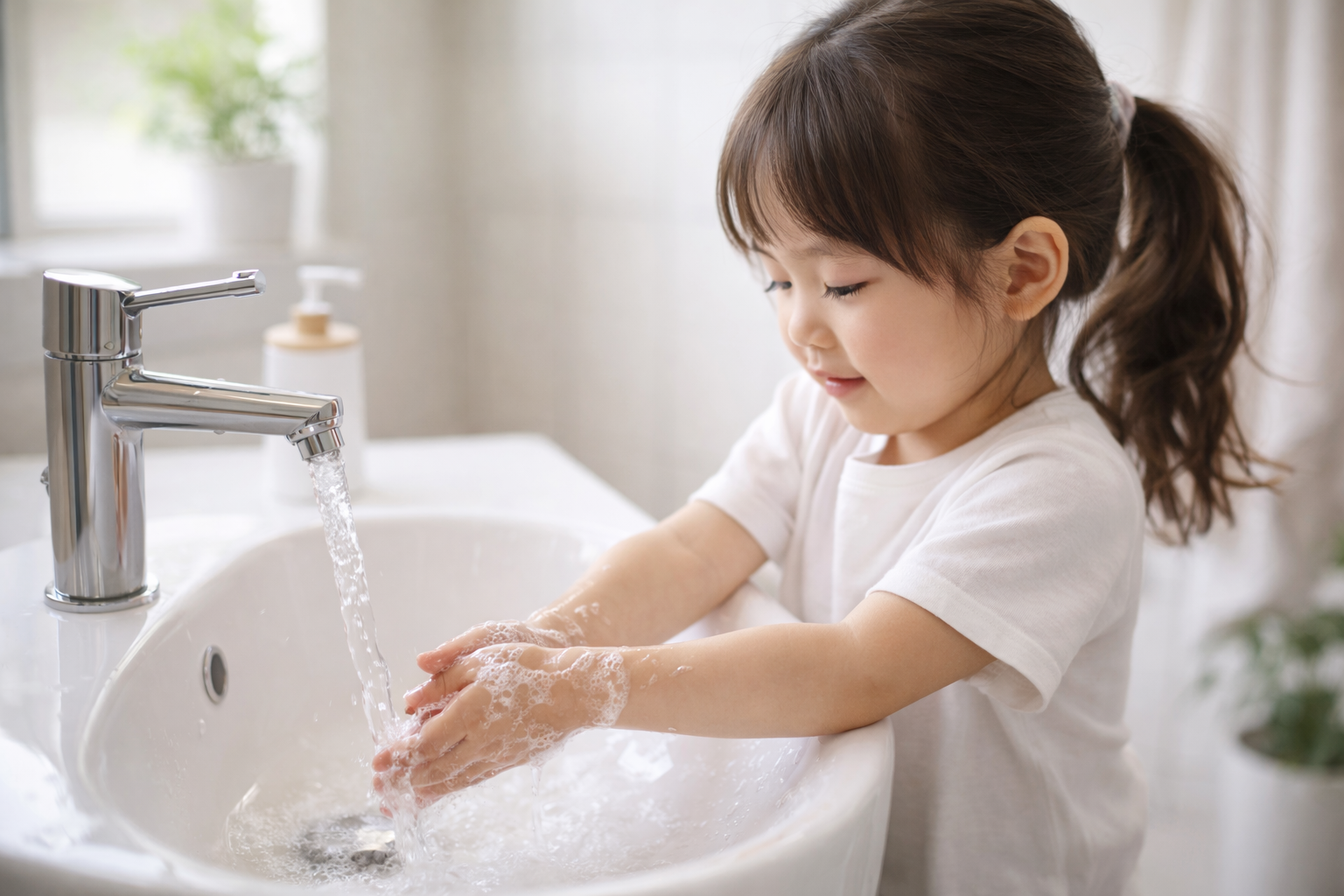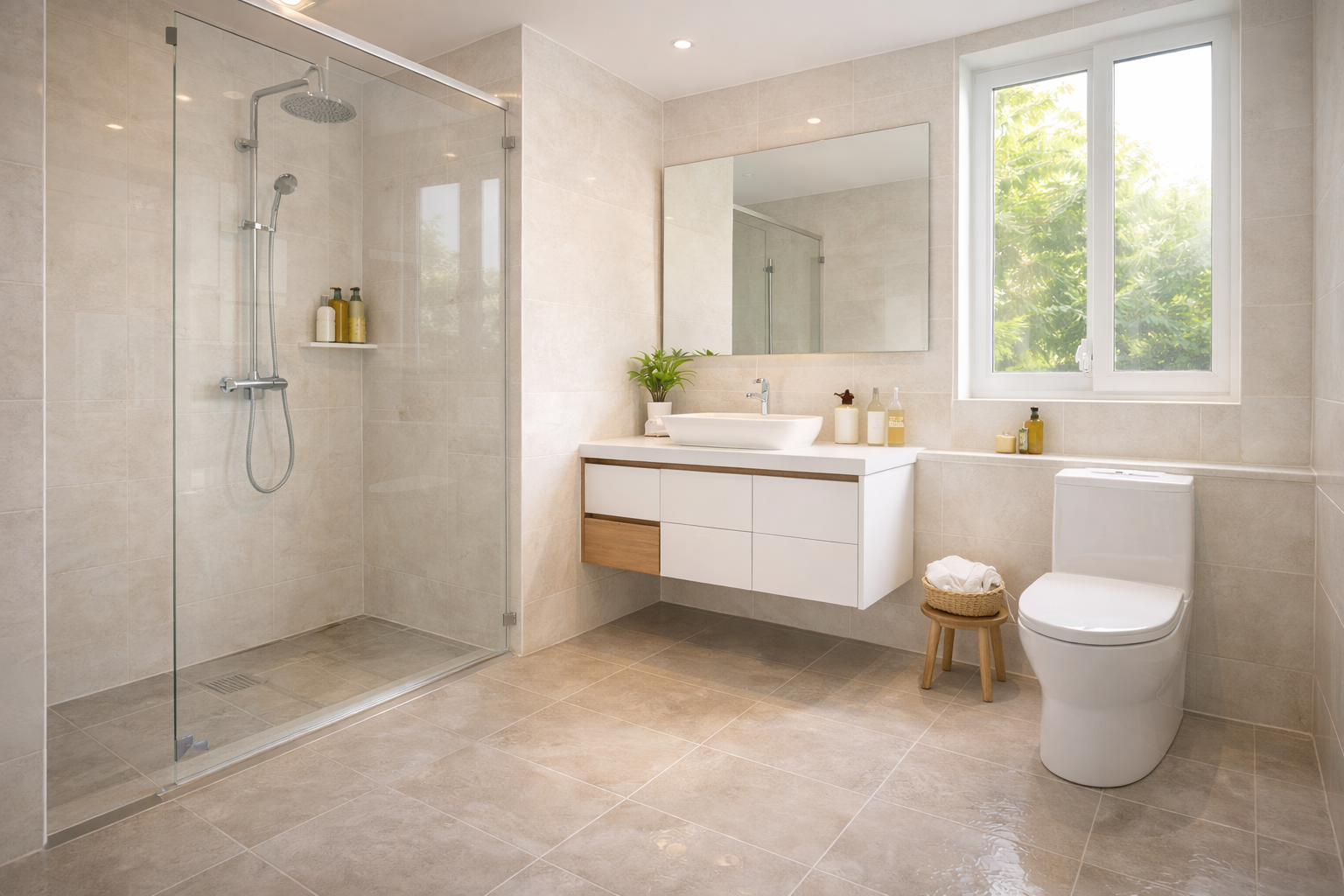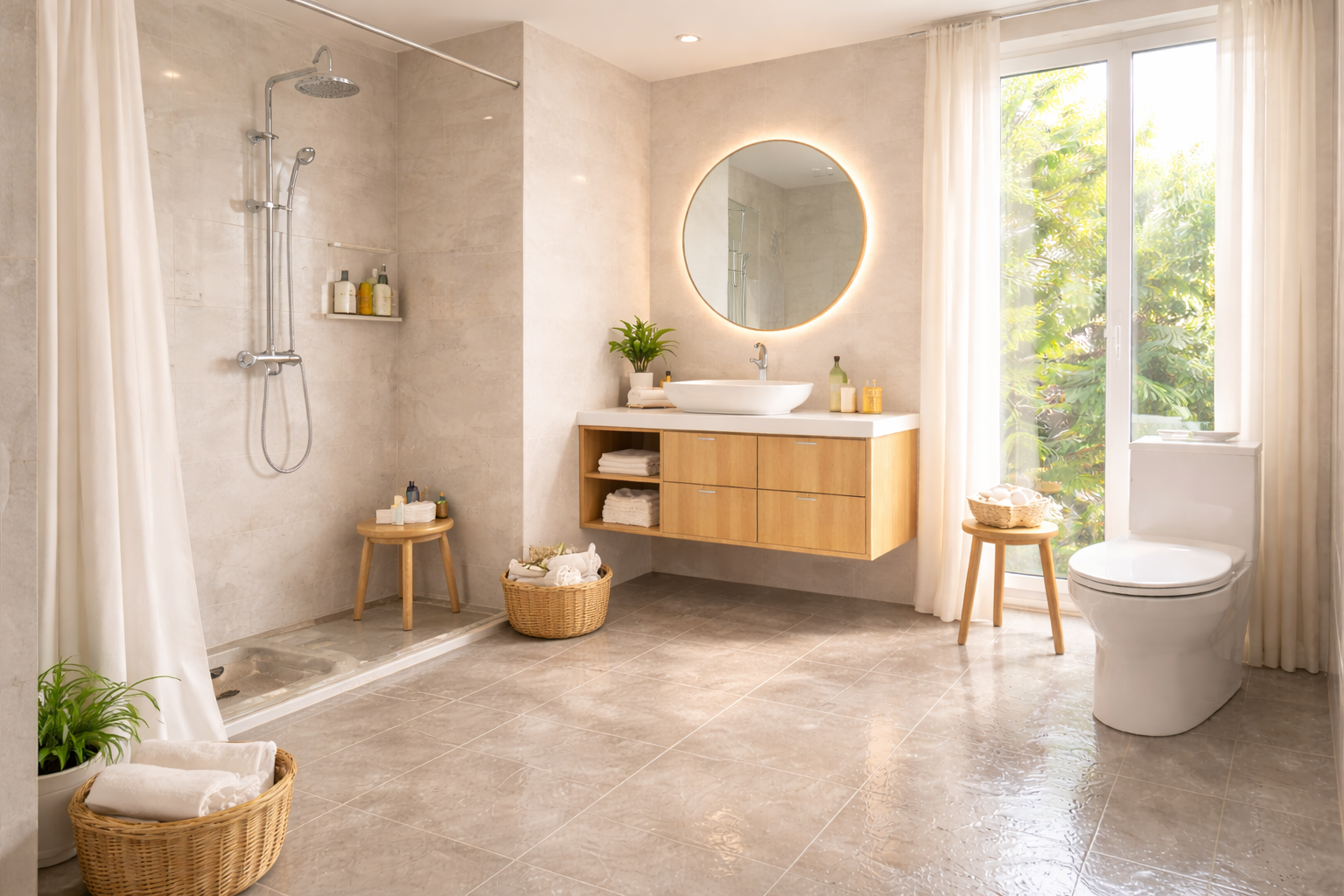 표면에 머무는 물과 오염을 줄이는 구조를 욕실에 적용했습니다.