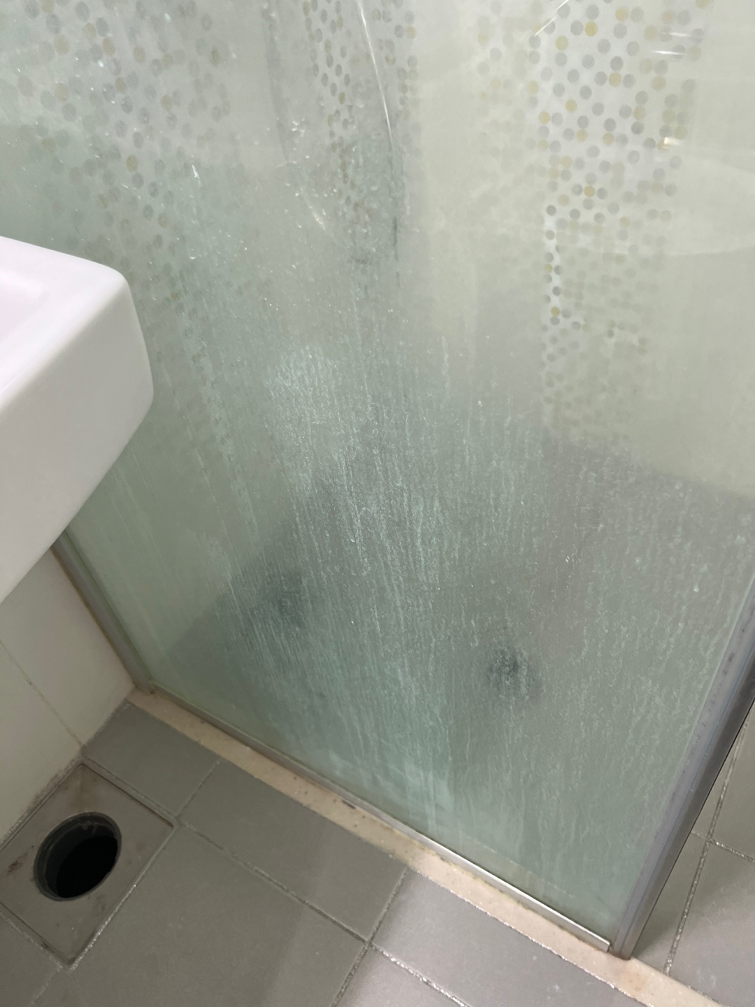 샤워부스 유리, 수전, 세면대 주변 타일, 욕실 바닥 등